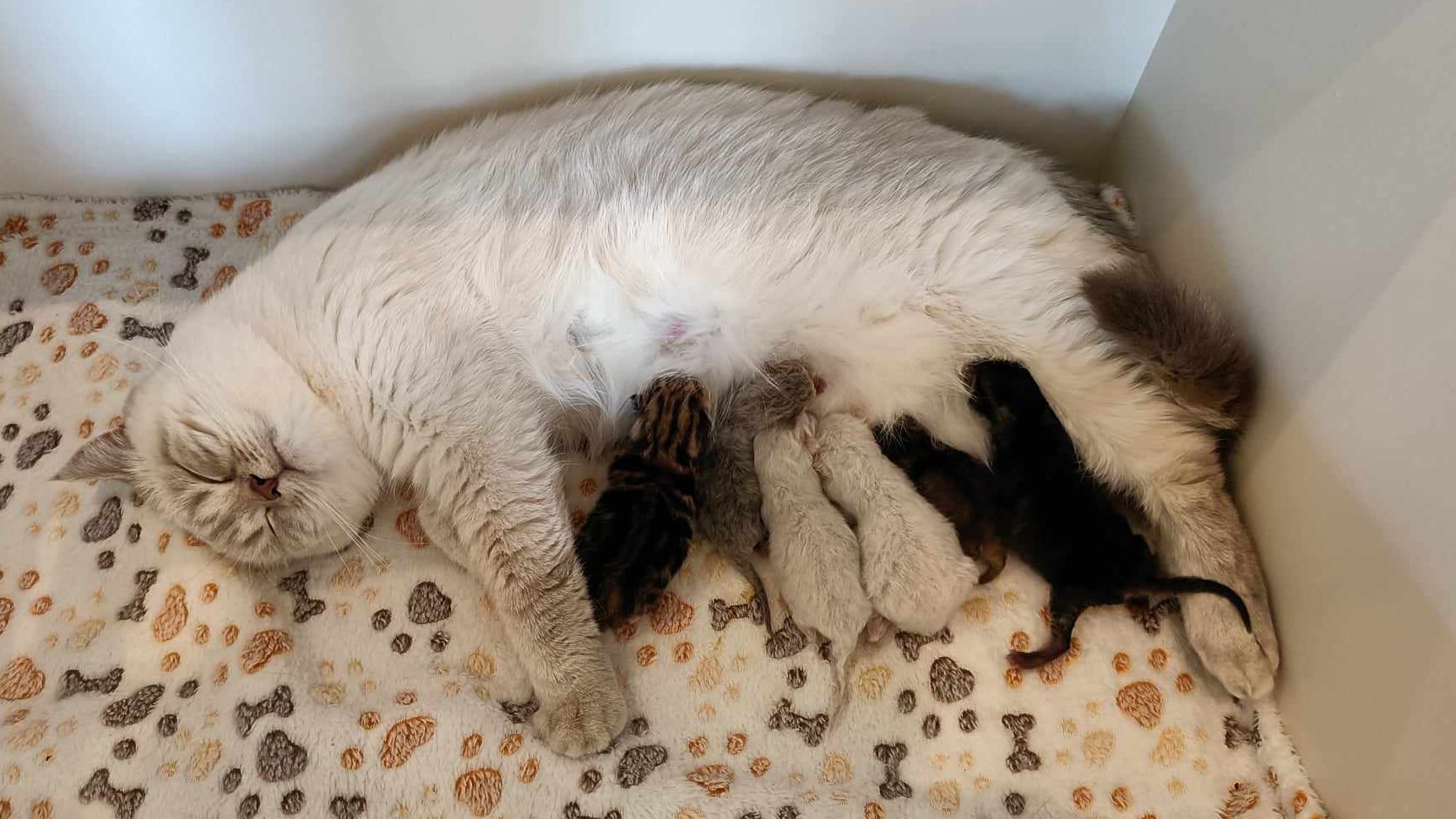 Copycat is op 10 april, dag 63 van haar zwangerschap, voor het eerst mama geworden van maar liefst 8 kittens! Jammer genoeg waren er 2 kittens niet levensvatbaar. Het was een zware bevalling die moeilijk op gang kwam omdat het eerste kitten in stuit lag en het tweede kitten al overleden was. Er werden ook 2 mini kittens geboren die we momenteel om de 2 uur aan het bijflessen zijn in de hoop dat ze mogen blijven leven. Copycat is een geboren moedertje die niet weg te slaan is bij haar kittens. We zijn zo fier op haar!